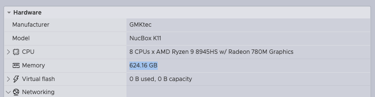 [root@hades:~] esxcli storage core device partition list Device Partition Start Sector End Sector Type Size -------------------------------------------------------------------- --------- ------------ ---------- ---- ------------- t10.NVMe____Samsung_SSD_990_EVO_Plus_2TB____________755B42415C382500 0 0 3907029167 0 2000398934016 mpx.vmhba33:C0:T0:L0 0 0 976773167 0 500107862016 mpx.vmhba33:C0:T0:L0 1 2048 976768064 fb 500104200704 mpx.vmhba32:C0:T0:L0 0 0 30283007 0 15504900096 mpx.vmhba32:C0:T0:L0 1 64 204863 0 104857600 mpx.vmhba32:C0:T0:L0 5 208896 2306047 6 1073741824 mpx.vmhba32:C0:T0:L0 6 2308096 4405247 6 1073741824 mpx.vmhba32:C0:T0:L0 7 4407296 30282974 f8 13248347648 t10.NVMe____Samsung_SSD_990_EVO_Plus_2TB____________7D5B42415C382500 0 0 3907029167 0 2000398934016
