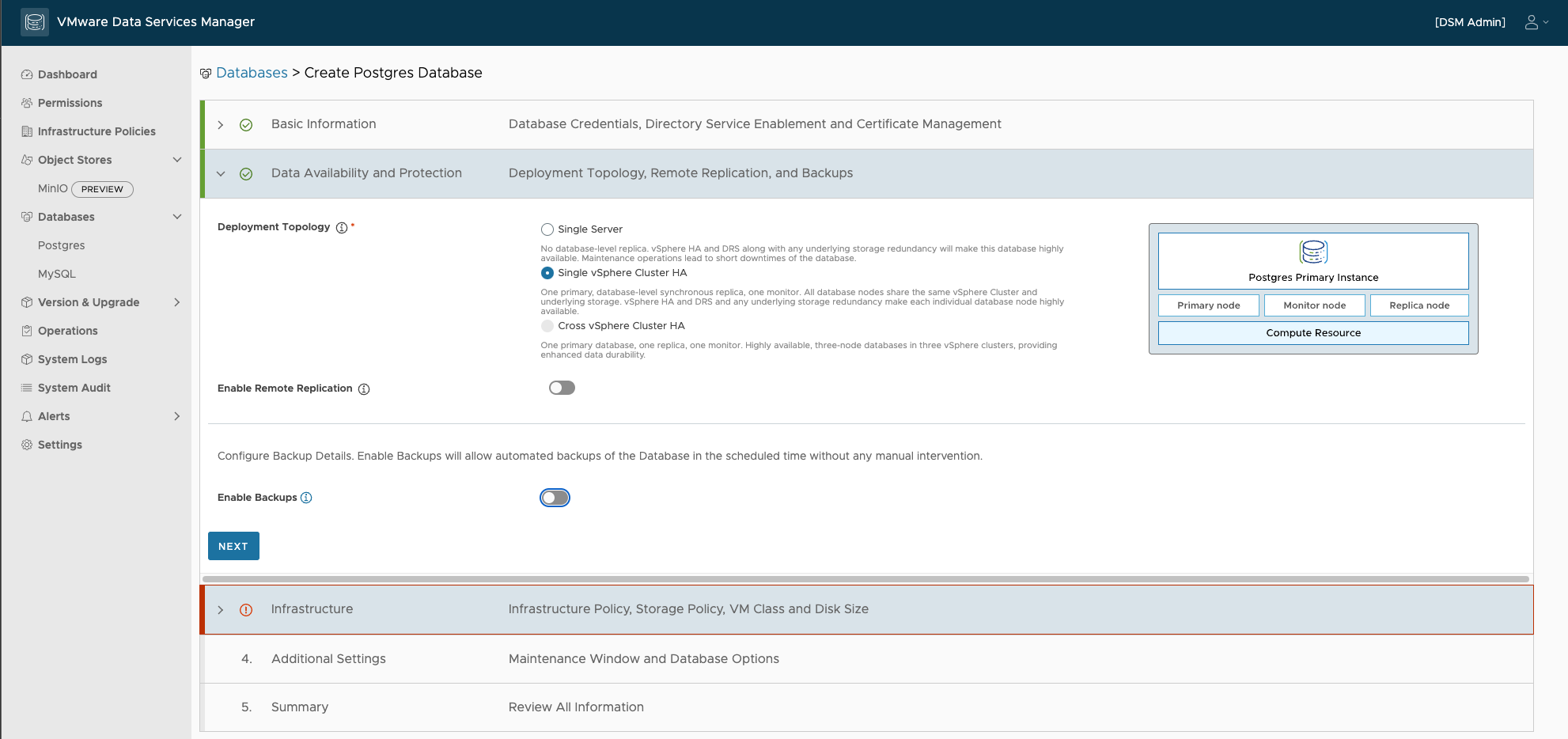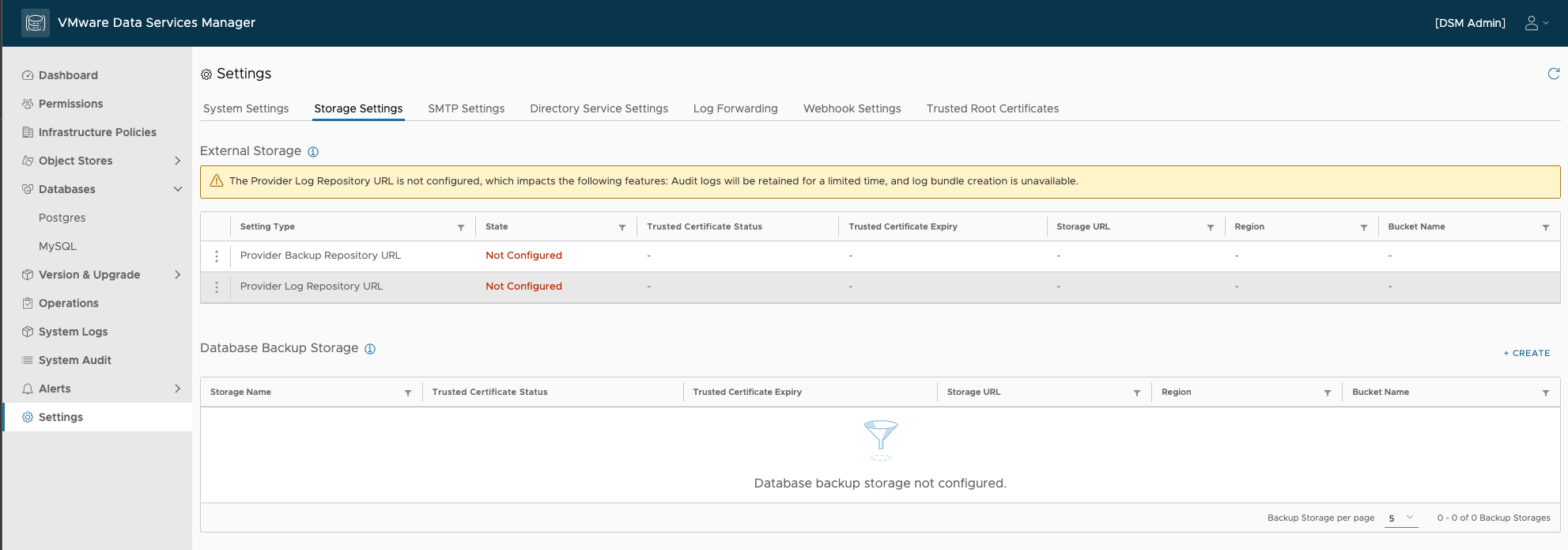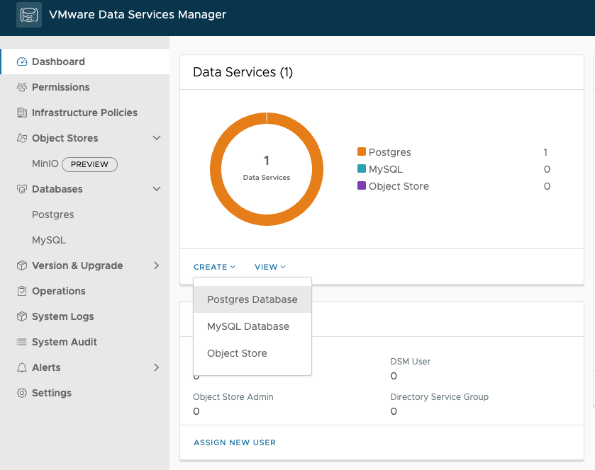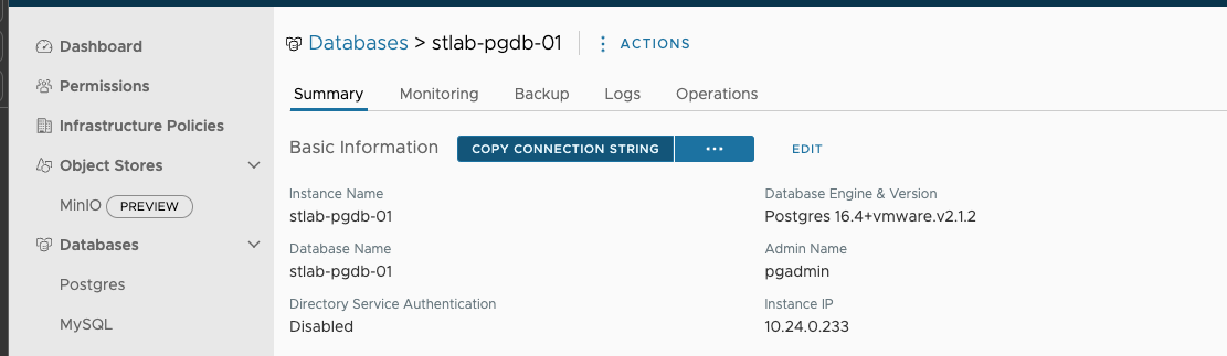 Mittels VMware Services Manager (DSM) lassen sich Datenbanken (MySQL, PostgresDB) sowie MinIO S3 Buckets einfach provisionieren. Ebenfalls integriert DSM das Lifecycle der Datenbanken, eine Backuplösung sowie Monitoring und Alerting Funktionen. DSM ermöglicht es sehr schnell einen Database-as-a-Service bereitzustellen.
