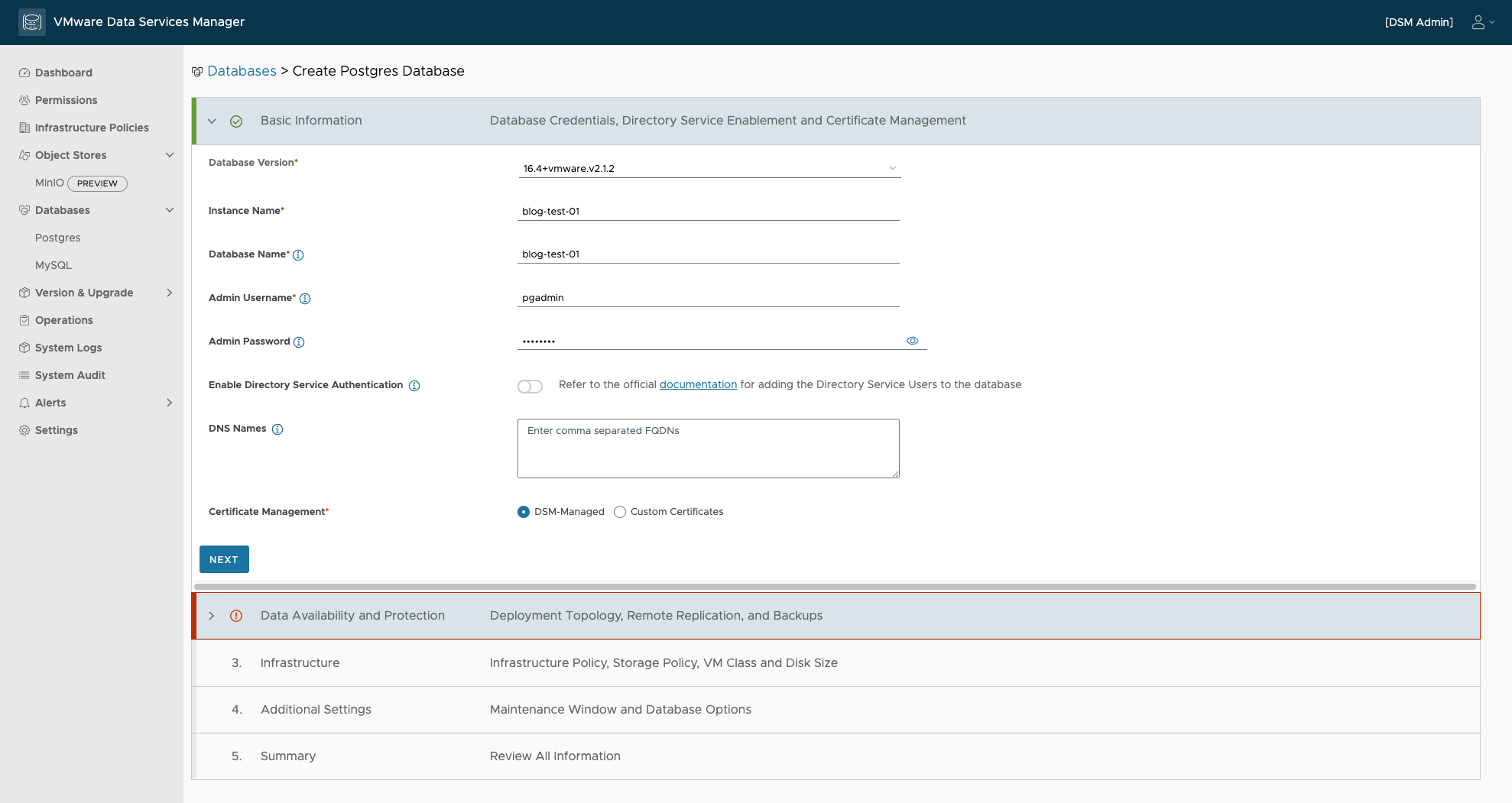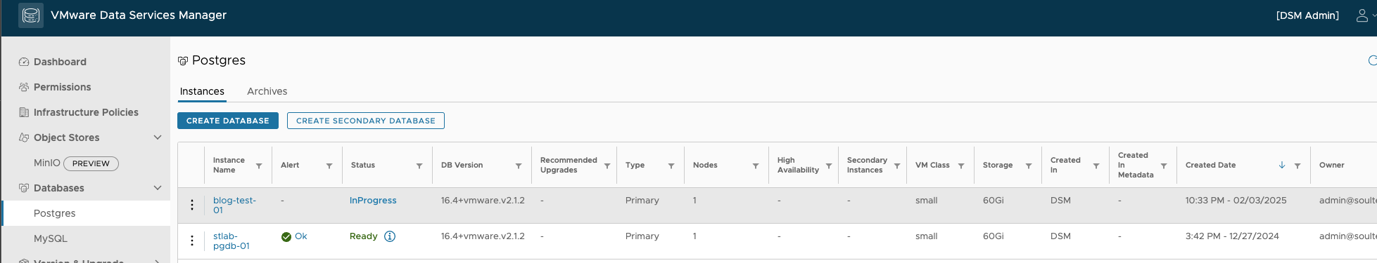 VMware Data Services Manager ermöglicht es mit minimalen Footprint und Setup, Datenbanken wie Postgres und MySQL einfach zu provisionieren. Mühsame manuelle Schritte wie VM Erstellung, Konfiguration des DBMS, Lifecycle Management werden komplett übernommen.