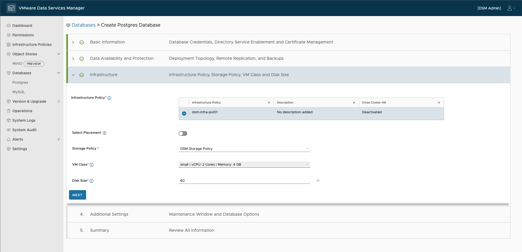Die Compute Ressourcen für die Postgres Installation werden mittel definierten VMClasses (in vCenter via DSM Infrastructure Policies definiert) konfiguriert: