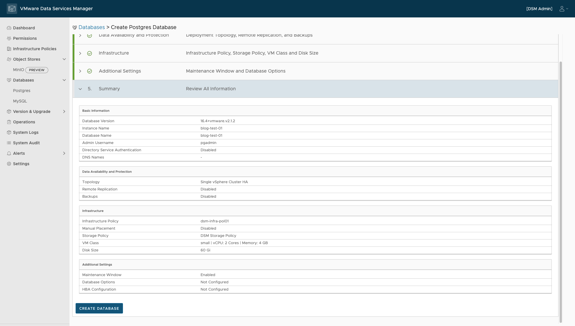 Zum Abschluss werden die gewünschten Parameter nochmals angezeigt, mittels “Create Database” werden nun die entsprechenden VMs in vCenter provisioniert und die Installation von Postgres gestartet.