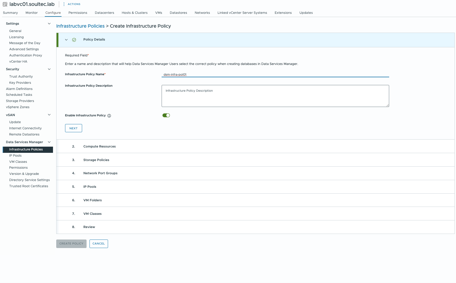Das Plugin ermöglich neue Funktionen im vCenter. Initial werden einige Policies (Compute, Storage, Network) definiert, diese definieren wie die DB Workloads provisioniert werden: